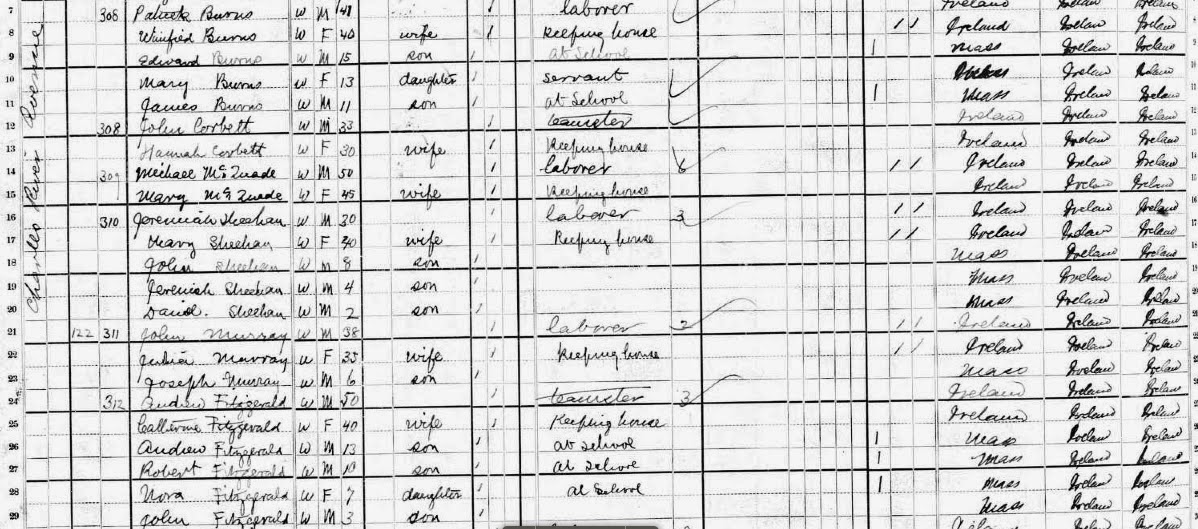 This is the entry for the 1869 Boston City Directory. There is Andrew who at this time would be living with his wife and oldest son at 10 Charles River Avenue. Next came the 1880 Federal Census, just to make sure I had the right Andrew Fitzgerald.